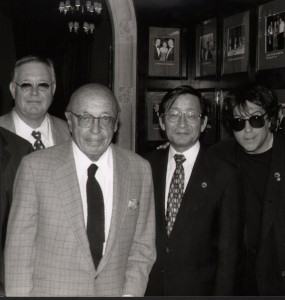 Straight Line/SEG pacts with Atlantic Records for distribution. L. to R. Dick Meixner (SEG), Atlantic chairman Ahmet Ertegun, unidentified Denon Japan exec, FLR.