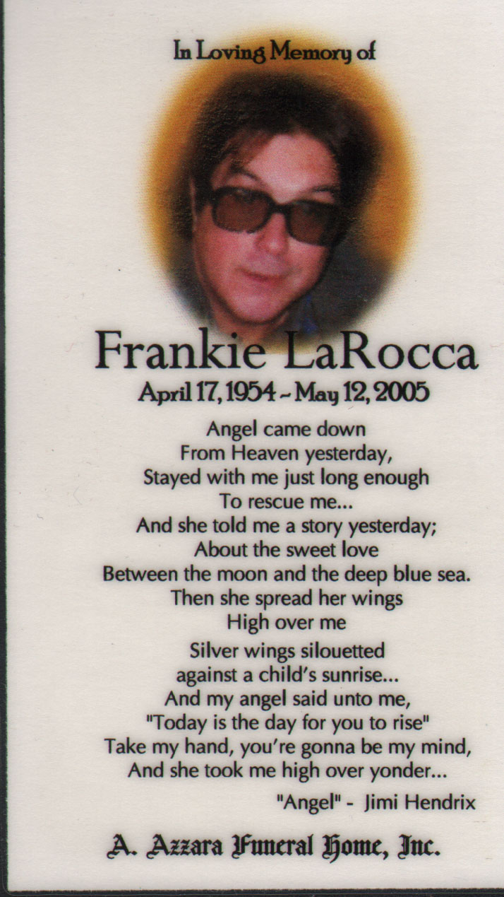 Today (5/12/2010) marks the fifth anniversary of the untimely death, at age 51, of my good friend Frankie LaRocka.For several years prior to his passing, Frankie had been living with the debilitating heart condition called cardiomyopathy. On or about 5/5/2005, he underwent surgery at New York’s Columbia–Presbyterian Hospital to have a defibrillator implanted to regulate his heartbeat. He returned to his home at 55 Walbrooke Avenue on Staten Island but developed a high fever a few days later. He was admitted to St. Vincent’s Hospital on SI where the fever turned into pneumonia that Frankie, in his weakened post-operative condition, could not withstand.