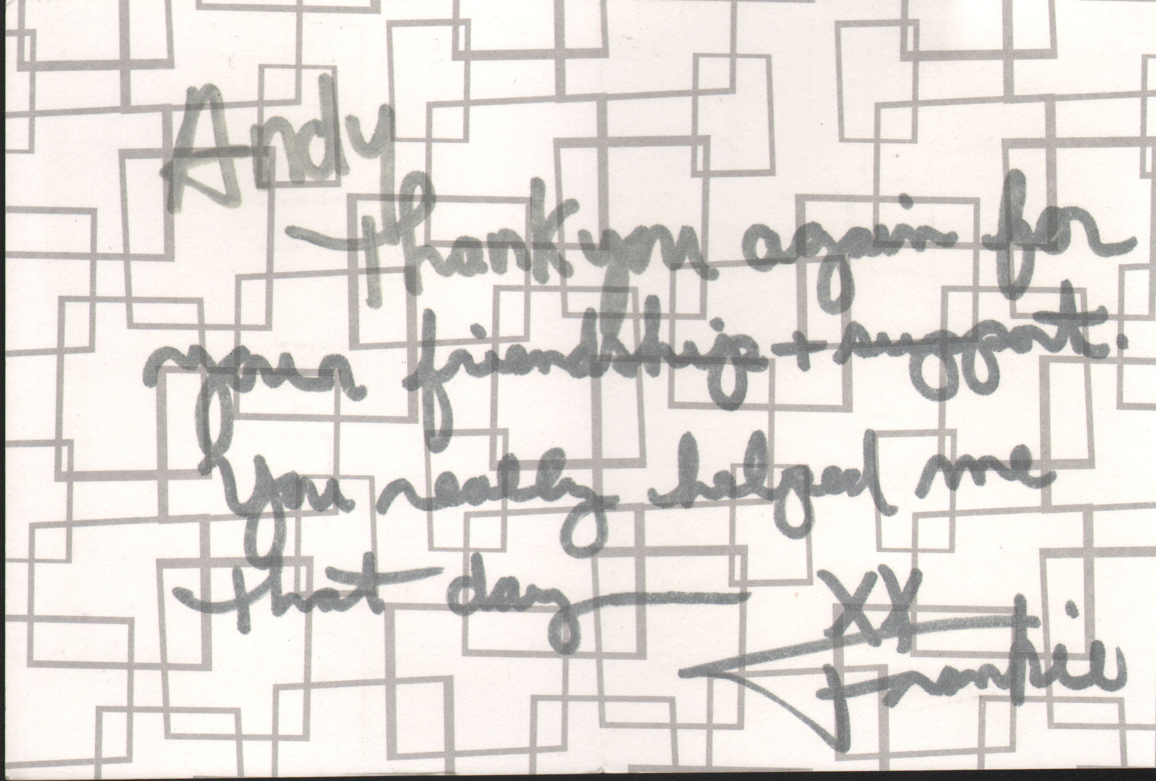 Frankie had never given up the drums and had ample practice space in the Walbrooke Avenue house that he owned and occupied to the end of his life. In the early Nineties, he played some sporadic gigs (mostly in Europe) with bassist Noel Redding of the Jimi Hendrix Experience. A 1995 show in Prague, with Ivan Kral and Anthony Krizan on guitars, was released in 2002 as Live from Bunk R – Prague by Noel Redding & Friends. But any real friends (or fans) of the participants should steer clear of this set of Hendrix and classic rock cover versions. (Noel Redding died May 11, 2003 at age 58. Among Frankie’s papers, I found and saved several handwritten postcards that Noel mailed to FLR from his home in County Cork, Ireland.)