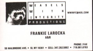 It was Frankie’s biggest hit for Atlantic, where he also worked with Blue Rodeo and Dirty Looks, and on the two-million selling Lost Boys soundtrack. After moving to Epic Records, his office decor included a framed note from Mr. Big manager Herbie Herbert stating that FLR was the person responsible for the band’s signing to Atlantic. This kind of recognition was important to Frankie, who deeply resented other higher–ranking executives’ occasional attempts to take credit for his discoveries.