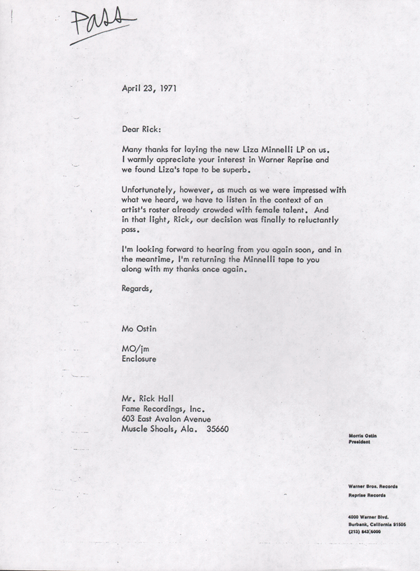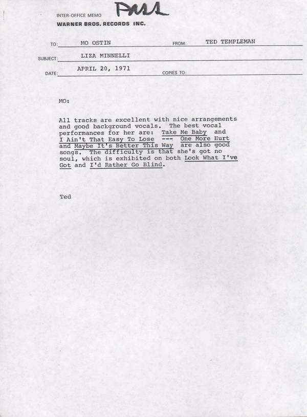 How do we know such an improbable recording even exists? Because the Minnelli/Muscle Shoals sessions left a paper trail through the Burbank CA headquarters of Warner Bros. Records. It begins with this memo from Rick Hall to WB President Mo Ostin, accompanying a tape of the just-completed album: