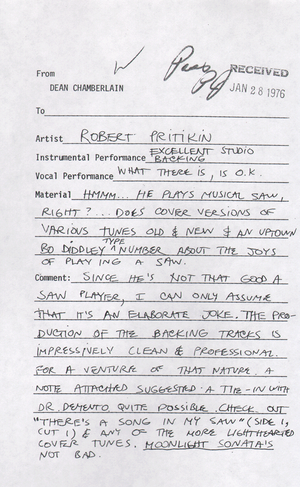 In 1975, Bob Pritikin financed the recording and manufacture of his own album of “saw songs.” He was sufficiently wealthy and connected to obtain the services of “practically half the San Francisco Symphony string section and a chorus from the Edwin Hawkins Singers” of “Oh Happy Day” fame. In November of that year, Pritikin submitted a copy of his LP to Mo Ostin, president of Warner Brothers Records, accompanied by this pitch letter: