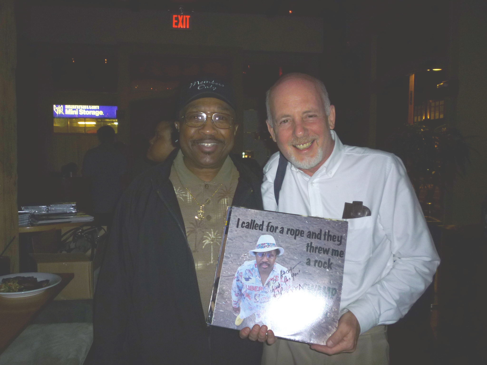 A.S. and Swamp Dogg bond over my copy of his 1989 LP "I Called For A Rope And They Threw Me A Rock." (Photo by Howard B. Leibowitz)